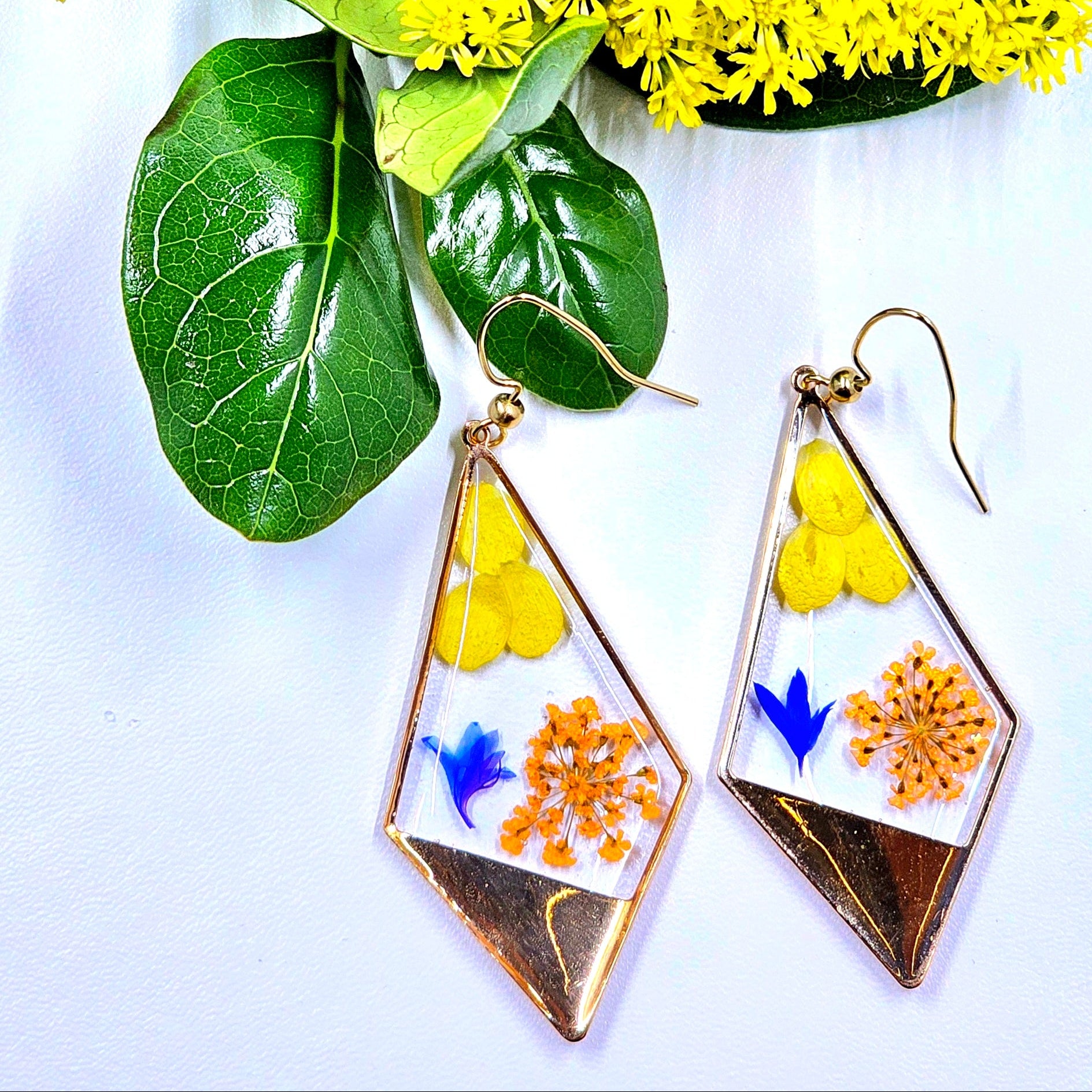 These beauties are handmade with Daisy Petals, Queen Anne's lace flowers, and tiny Wildflower petals and then sealed in UV resin. They are very light and can be worn all day long.