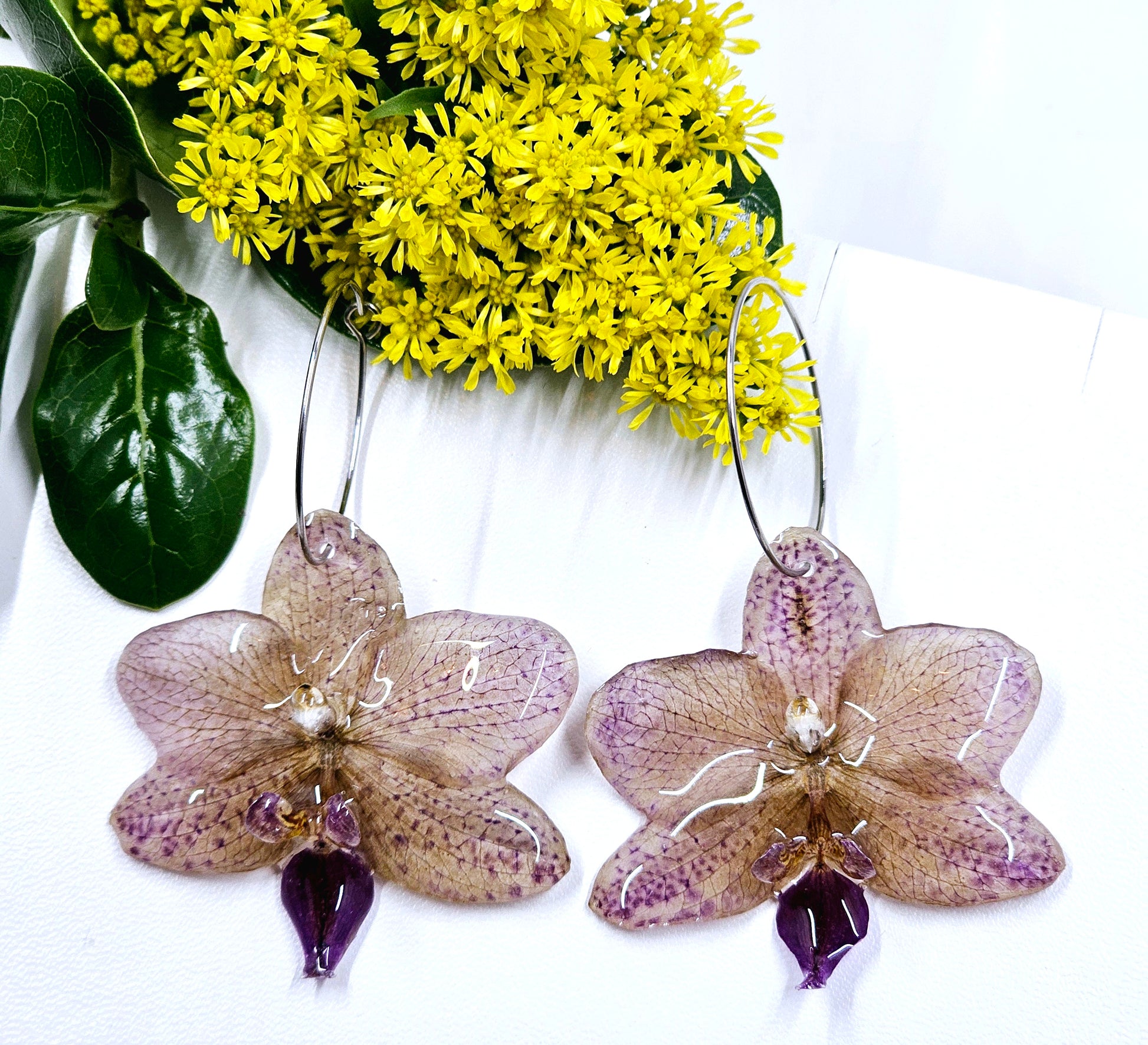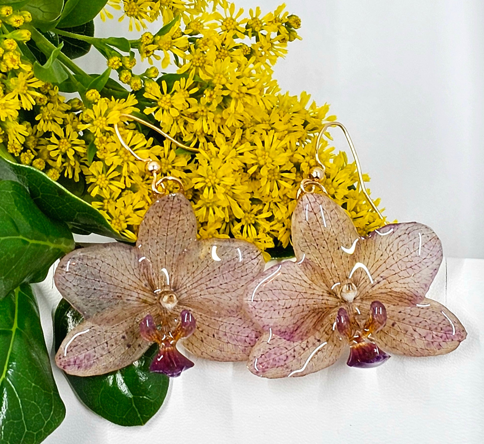 These earrings are made with small spotted purple orchids preserved in resin.