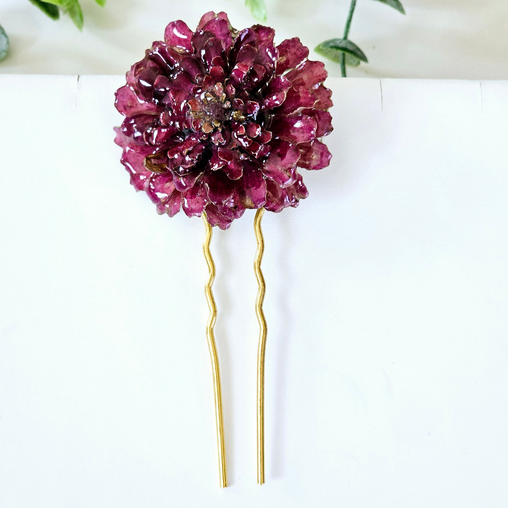 These hair pins are made with real Zinnia flowers preserved in UV resin.